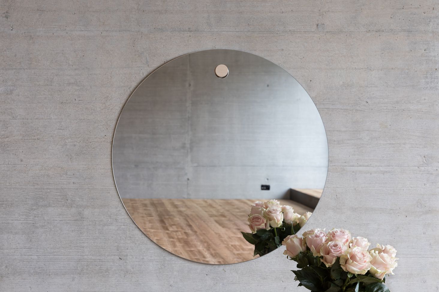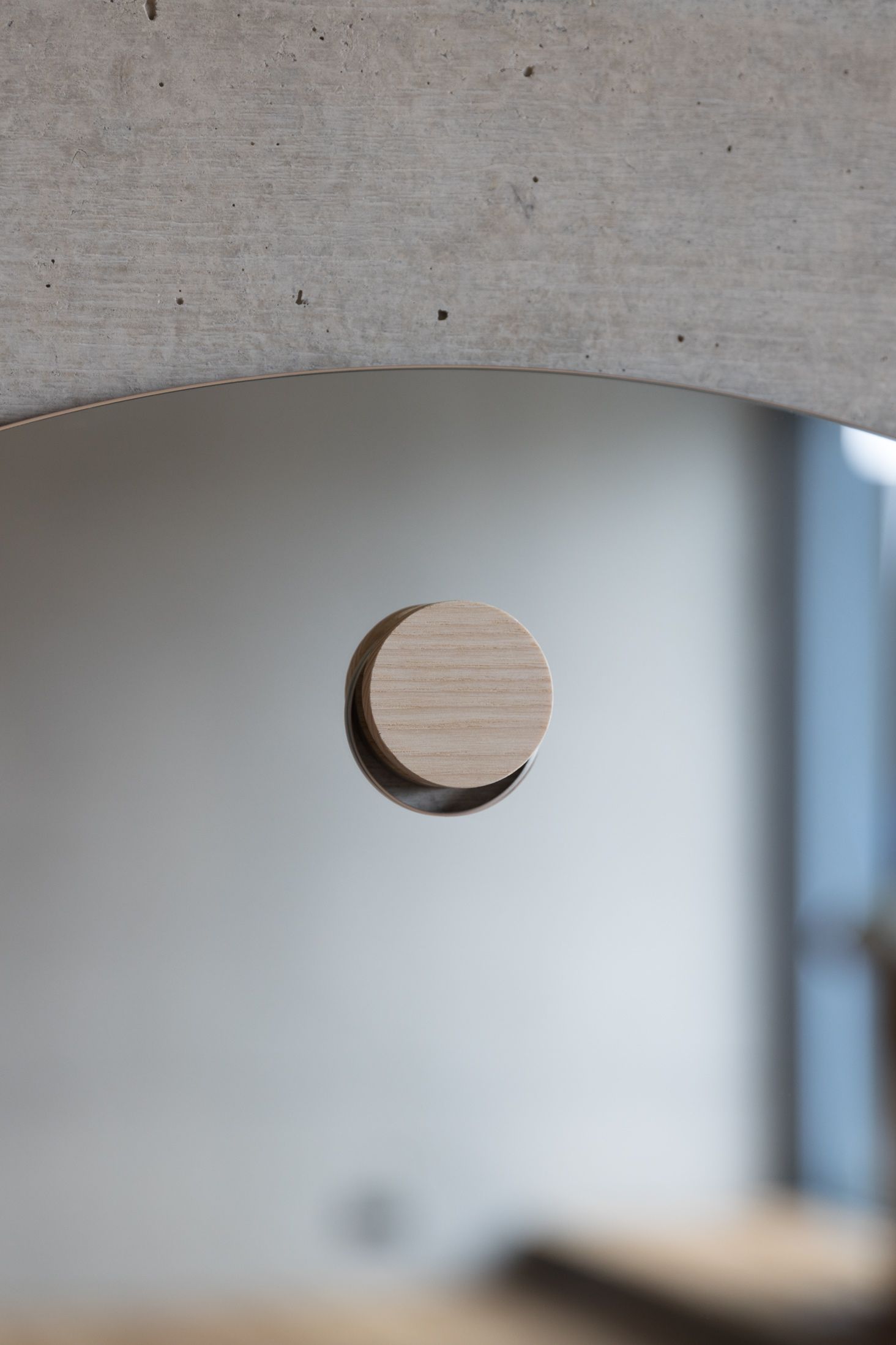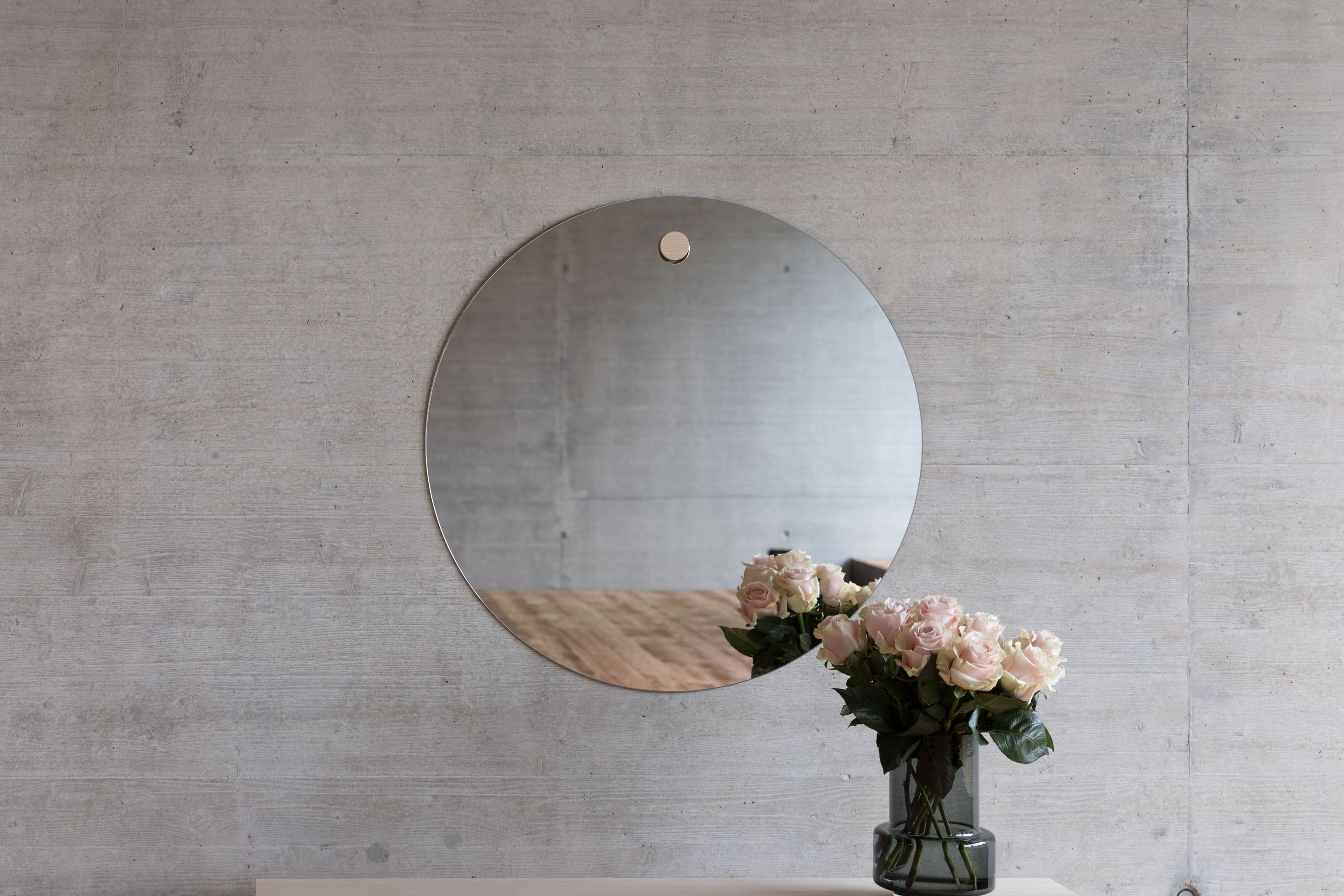 Aus den beiden Naturmaterialien Holz und Glas entsteht ein authentisches Designobjekt. Der Zapfen aus Eschenholz trägt das ausladende, kreisförmige Spiegelglas. Essential wird lokal produziert und kann einfach an die Wand fixiert werden.